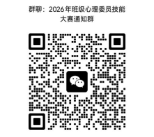 方式:心理知识竞赛采用线下闭卷方式进行。请各学院于3月20日17:00前填写《2026年度班级心理委员技能大赛参赛人员统计表》(见附件),并通知参赛学生微信扫描以下二维码进入“2026年班级心理委员技能大赛通知群”,方便接收后续相关安排通知。