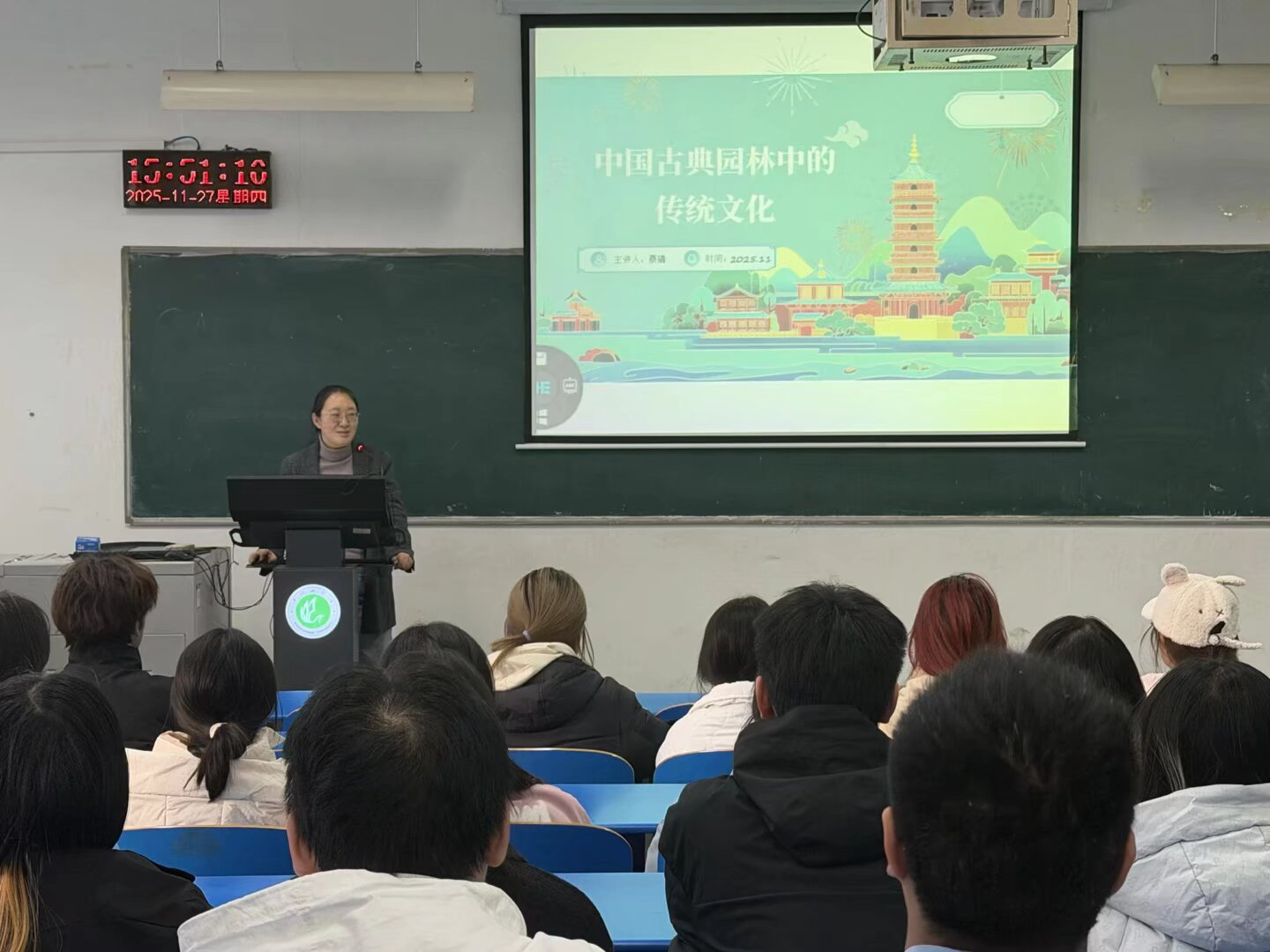 2025年11月27日下午,国鼎文化讲堂之《中国古典园林中的传统文化》在1106教室成功举行。本次讲座由艺术设计学院副教授蔡清担任主讲。